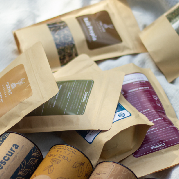 La pureza de la yerba orgánica «cortada a cuchillo» se combina con una churna en formato doypack. (Presencia, Impulso, Origen, Aliento o Frescura).