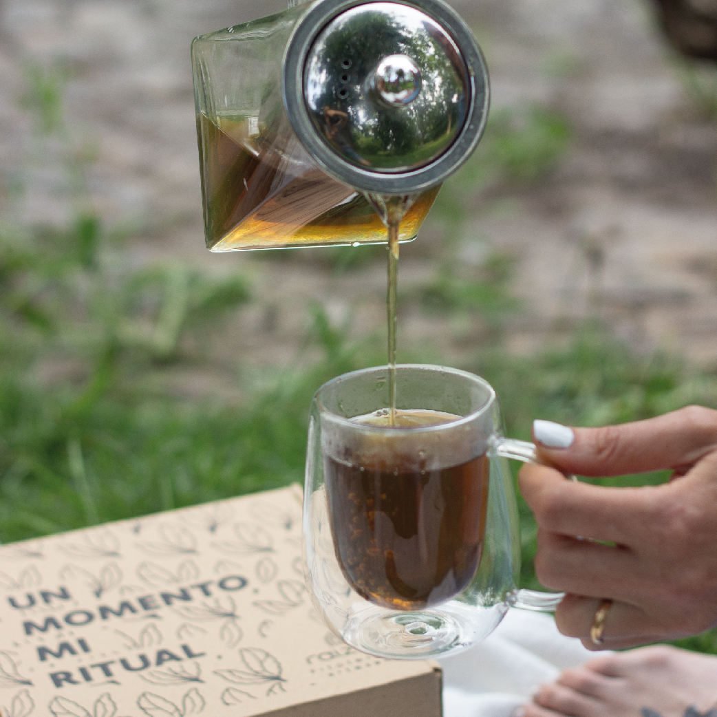 El Ritual del Té incluye: churna en lata (150 g), taza de vidrio de 250 ml, infusor artesanal de mimbre, cuchara biodegradable y tarjeta de intención.