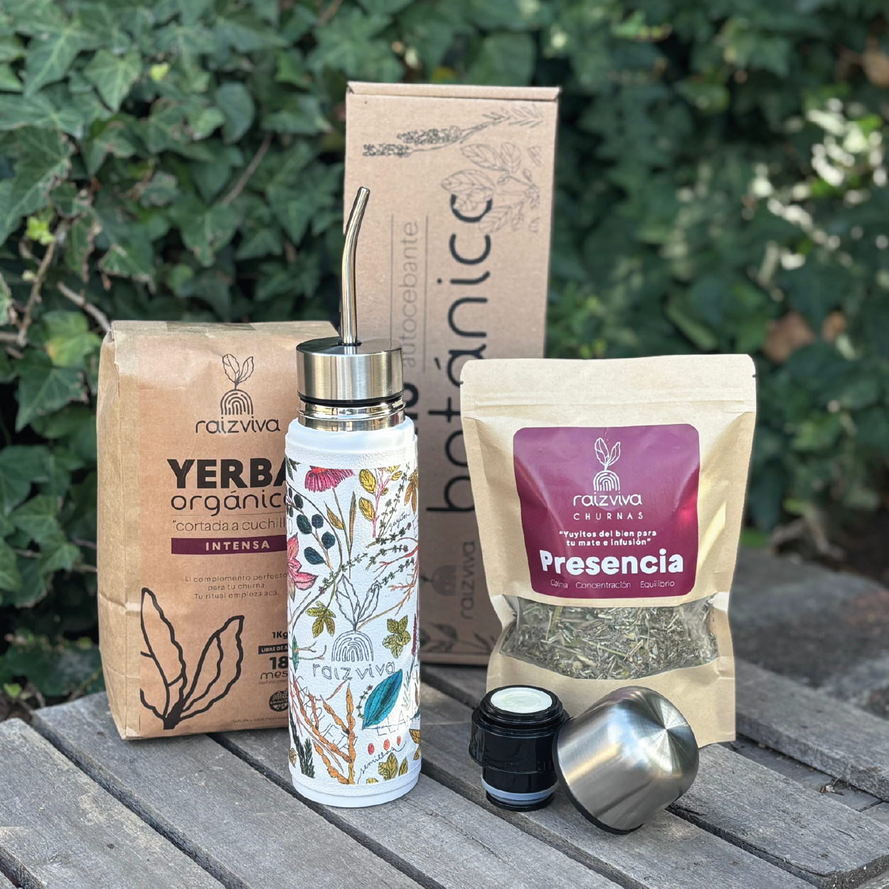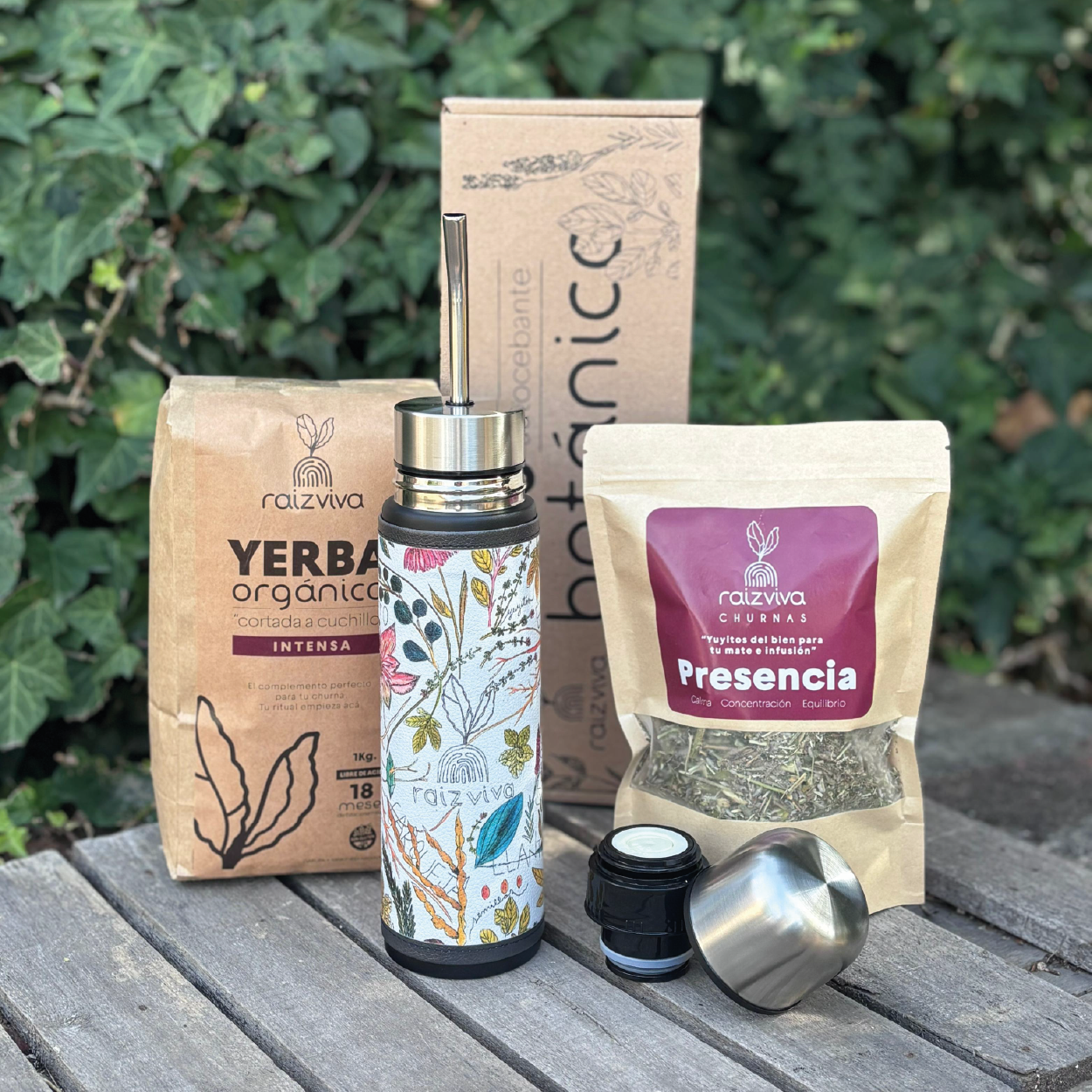 Este kit incluye nuestro Termo Mate Botánico – Edición Especial, una pieza única creada por Raíz Viva.
